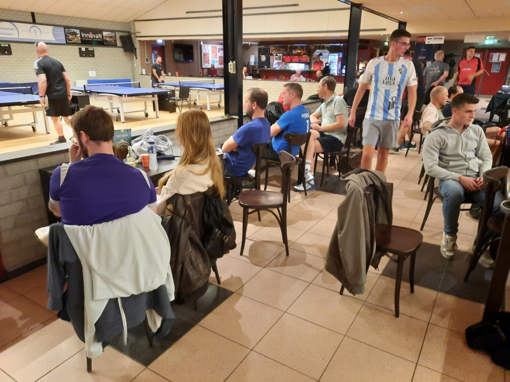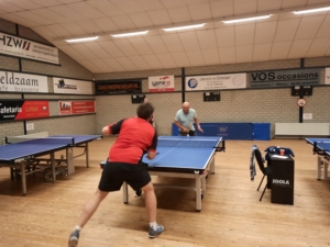 In poule C werden weer vier wedstrijden gespeeld. Cafetaria Lotus Veenendaal met Cees en Rein namen het op tegen Bart en Gert-Jan van Eitje van de Boer. Cees beet het spits af tegen Bart en won deze pot in vier games. In de tweede pot won Rein ook van Gert-Jan, waardoor het tweede punt ook voor Cafetaria Lotus Veenendaal was. In de dubbelpartij hadden Cees en Rein ook maar drie games nodig om Bart en Gert-Jan te verslaan. In de vierde pot wist Bart in drie games Rein te verslaan. Tot slot in de laatste pot won Cees in drie games van Gert-Jan. Einduitslag Cafetaria Lotus Veenendaal – Eitje van de Boer 4-1. De tweede wedstrijd ging tussen potlood.dev 1 vertegenwoordigd door Gert Jan en Florian die tegenover Ben en Timo van Bentech Metaal aan de tafel stonden. Gert Jan verloor de eerste pot maar net in vijf games van Ben een laatste game 8-11. Daarna was het de beurt aan Florian om het Timo lastig te maken en dat lukte Florian heel goed. Timo had namelijk ook vijf games nodig om de winst te pakken. In de dubbelpartij ging het de mannen van Bentech Metaal een stuk gemakkelijker af. Zij wisten namelijk vrij eenvoudig in drie games de winst te pakken. Ook de vierde pot tussen Florian en Ben werd in drie games met 6-11, 10-12 en 1-11 door Ben beslist. Aan Gert Jan de opdracht om in de laatste partij de eer voor potlood.dev 1 oog te houden. En dat deed Gert Jan ook door in vier games van Timo te te winnen. Einduitslag potlood.dev 1 – Bentech Metaal 1-4. De volgende wedstrijd ging tussen potlood.dev 2 met Allard en Bart en Winston en Marcel van Petit Restaurant De Buffel. In de eerste partij werd Allard in drie games door Winston verslagen. Ook Marcel wist in de tweede pot in drie games van Bart te winnen. De dubbelpartij ging in vier games naar de mannen van Petit Restaurant De Buffel. In de vierde pot wist Bart ook niet van Winston te winnen. Maar in de vijfde pot ging Allard ten kosten van Marcel er in drie games met de winst vandoor. Einduitslag potlood.dev 2 – Petit Restaurant De Buffel 1-4. Tot slot ging de vierde wedstrijd in deze poule tussen Jan van der Staaij en Bert Blankestijn van Blankestijn Hypotheken – NBG en Ton en Adriaan van Autobedrijf Jacco de Gooijer. In de eerste pot wist Jan met drie keer dezelfde gamestand 11-5 van Ton te winnen. In de tweede pot ging Bert in drie games ten onder door van Adriaan te verliezen. De dubbelpartij werd in vier games door Ton en Adriaan beslist. De vierde pot tussen Bert en Ton had vier games nodig om Bert als winnaar aan te wijzen. Tot slot won Adriaan de laatste pot in drie games van Jan. Einduitslag Blankestijn Hypotheken – NBG – Autobedrijf Jacco de Gooijer 2-3.
