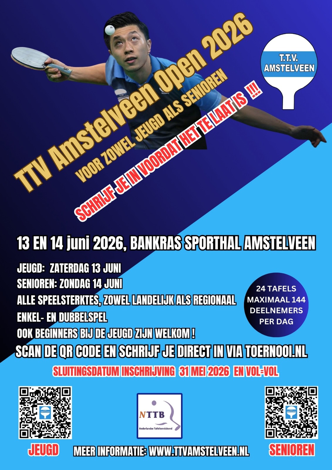 In 2025 zat ons toernooi met 144 deelnemers zowel bij de jeugd als senioren helemaal volgeboekt. Hierdoor en ook door de vele positieve reacties die we hebben gehad heeft TTV Amstelveen besloten om ook in 2026 weer een Open Toernooi te organiseren, de 4e editie inmiddels.
